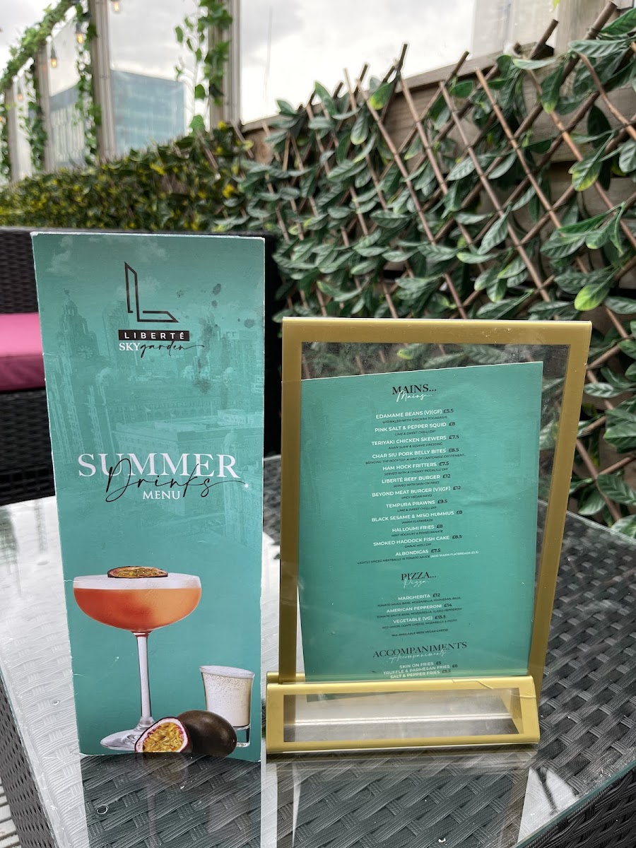 Welcome to Liberté Sky Garden, a culinary gem nestled in the heart of Liverpool. This rooftop oasis offers a delightful menu that perfectly complements its stunning city views. Begin your experience with tantalizing nibbles such as olives, wasabi peas, and lotus crisps, ideal for sharing or enjoying solo. The exploration continues with an array of classic cocktails, including favorites like the refreshing mojito and the vibrant strawberry daiquiri. For those seeking non-alcoholic options, delectable drinks like the Virgin Islands and Pom Pomme await.